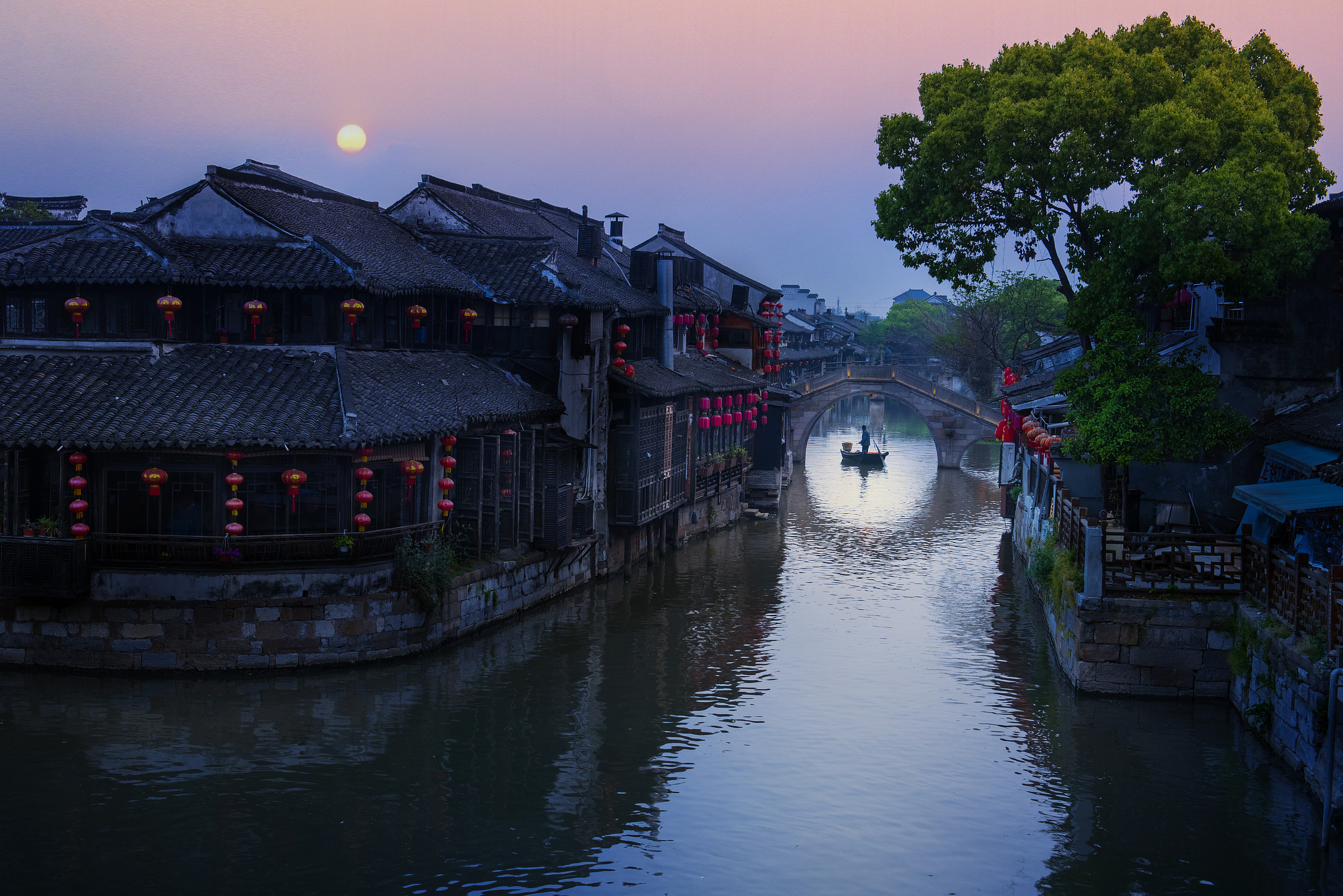 周庄是江南闻名于世的水乡古镇,镇上水路纵横,明清老建筑依河而建,画家陈逸飞笔下的双桥刻画出小桥流水人家的温柔,古镇南边的南湖开阔美丽。夜晚周庄亮了灯,又别有一番意境。