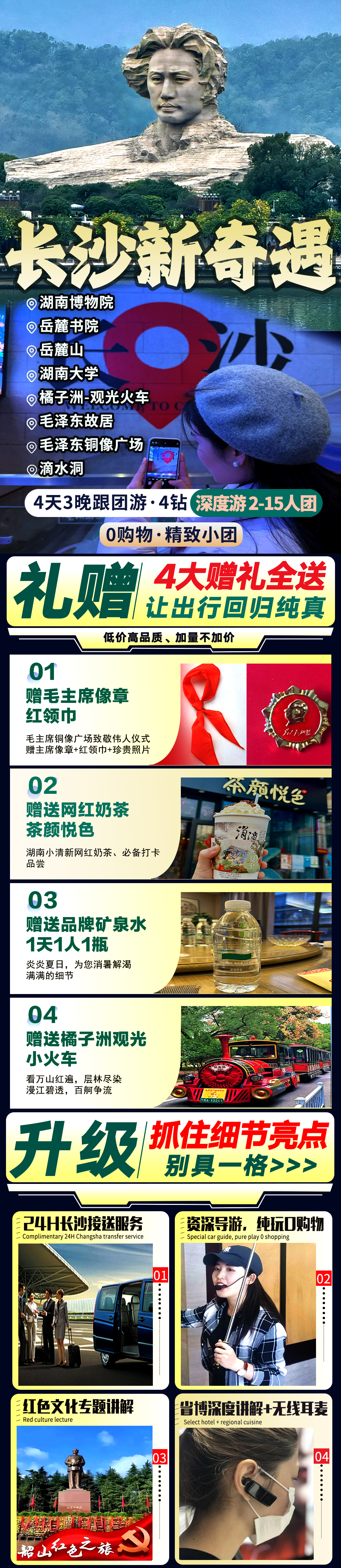 •贴心赠送:赠送佩戴毛主席徽章+红领巾+珍贵照片+长沙网红奶茶-茶颜悦色+品牌矿泉水1天1人1瓶+接送站安排1单1车专车不拼车