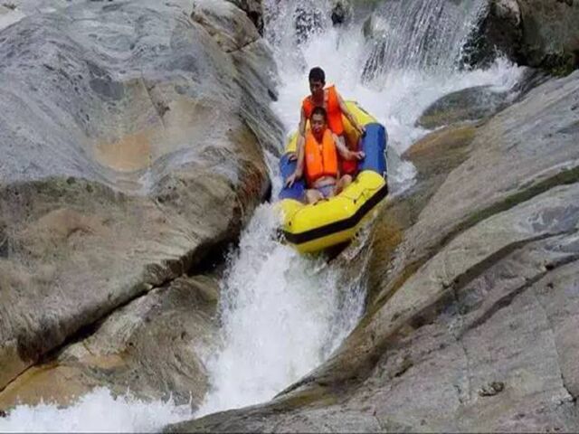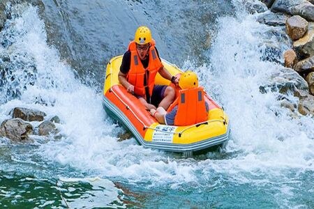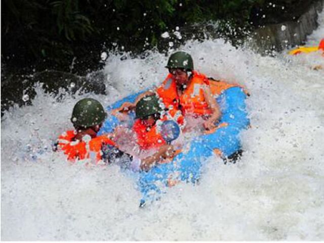 漂流艇进入滑道和跳台前,游客务必要正确放置划桨,双手紧抓安全绳,严禁松手严禁站立,坐稳身体,更安全的体验速度的刺激。