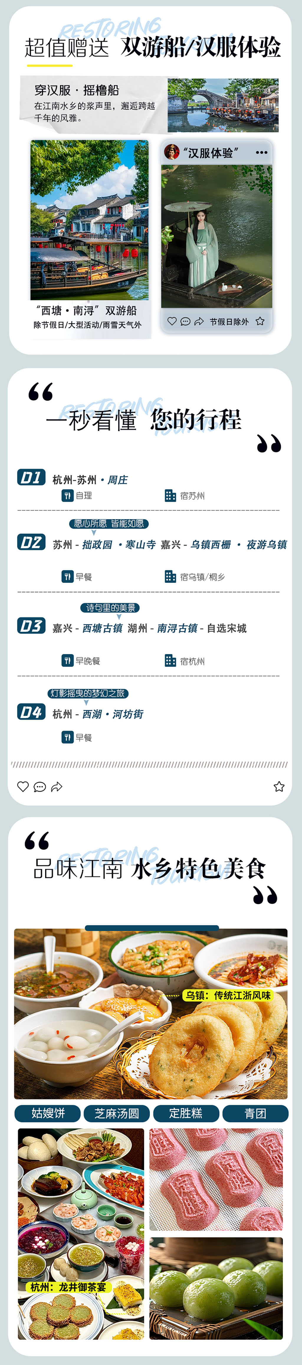 贴心赠送:除节假日、景区大型活动、雨雪天气等特殊日期外,赠送西塘景区游船和汉服体验,赠送的汉服体验需要的游客请主动联系导游协助领取。如您可享受景区免票政策,导游现退旅行社折扣价,但赠送项目无法体验,敬请谅解!