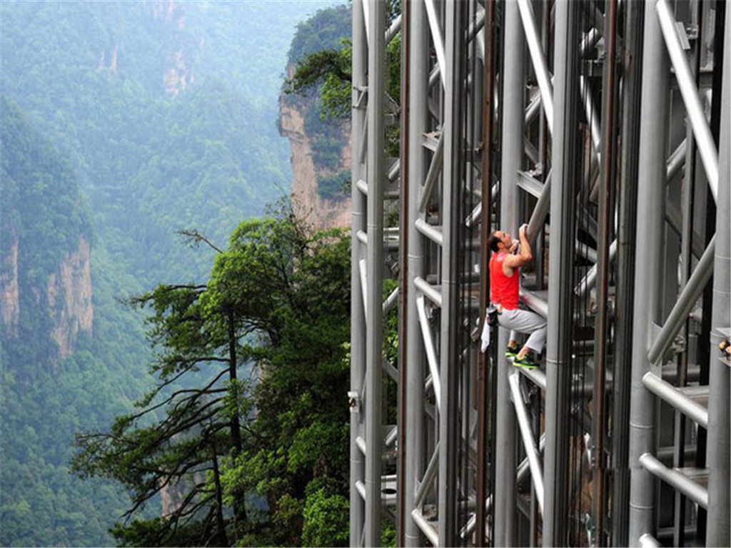 百龙天梯运行高度326米,比法国的埃菲尔铁塔还要高2米,由山体内部的坚井和着贴山体的井架组成,有三台电梯并排运行。游客在乘坐电梯时,可以透过玻璃欣赏张家界十大绝景之一的神兵聚会,神兵聚会位于百龙天梯正对面,由几十座相对独立的石峰组成。