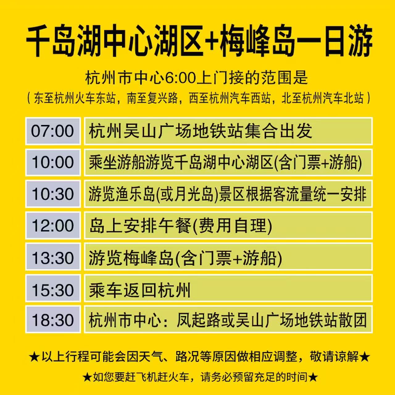 ③不在上门接范围的和不想早起的,请7:00到吴山广场地铁站C口集合。