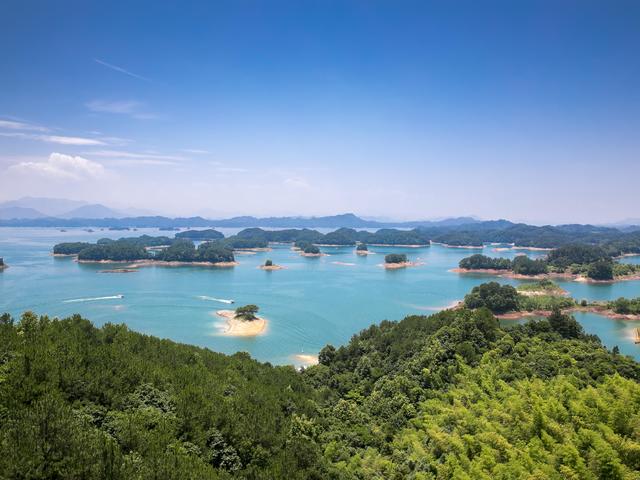 乘船进入千岛湖的核心湖区一中心湖区: 群山环抱着一湖碧水,万顷碧波中撒落着大大小小、或远或近的绿岛。远眺盈盈碧波,青山绿水金腰带的生态景观映入眼帘,美如画卷。