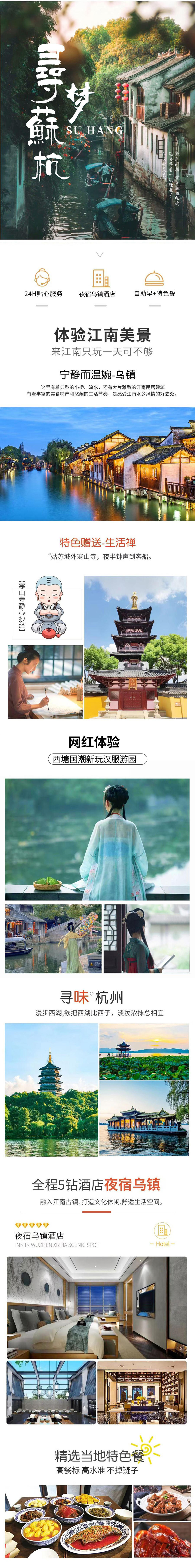 | 第2天 | 杭州→苏州 【君到姑苏见 人家尽枕河】含:早餐 | 拙政园 苏州寒山寺 乌镇西栅 西栅夜游 | 乌镇梵璞主题文化酒店(Fanpu Themed Culture Hotel) 海宁瑞莱克斯大酒店 乌镇子夜大酒店(Ziye Hotel) 濮院濮锦大酒店(Pujin Grand Hotel) 桐乡振石大酒店(Inspirock Hotel) | 早餐:包含 午餐:敬请自理 晚餐:敬请自理 |