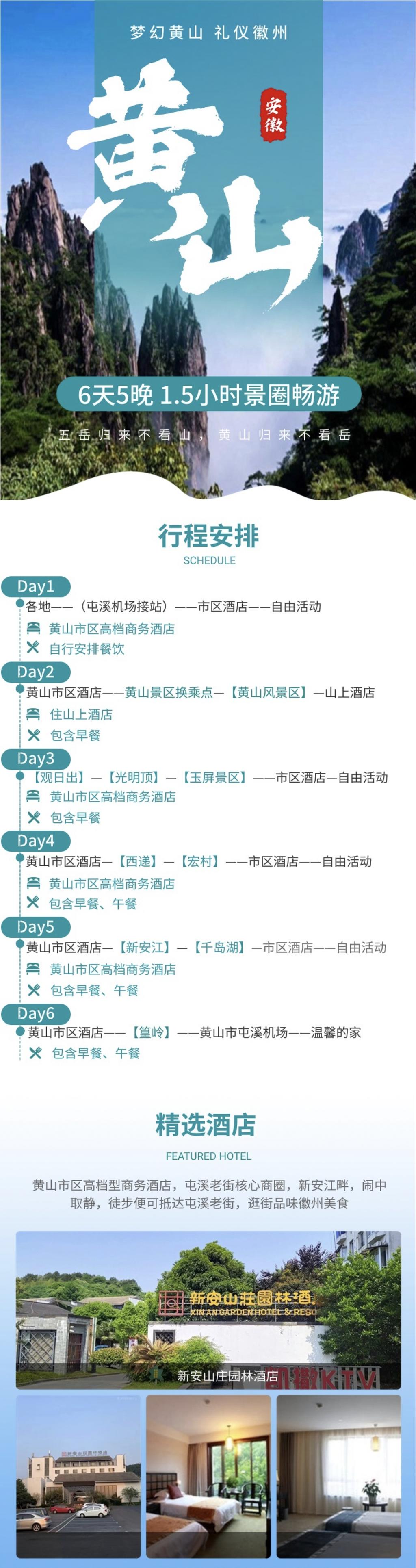 | 第6天 | 黄山风景区 - 黄山风景区 - 黄山市区(屯溪国际机场) - 温馨的家 |