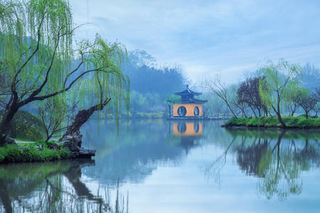 若乘船在湖中,就会有一番绿色的惬意,远远望去,连绵的山脉与碧绿的湖水相得益彰。妙的是下点春雨啊!山被笼上一层朦朦的雾,好似带有一分仙气,真是“山色空蒙雨亦奇”,船缓缓前行,几处谭围着湖水,映和着隐约的雷峰塔,引人入胜!