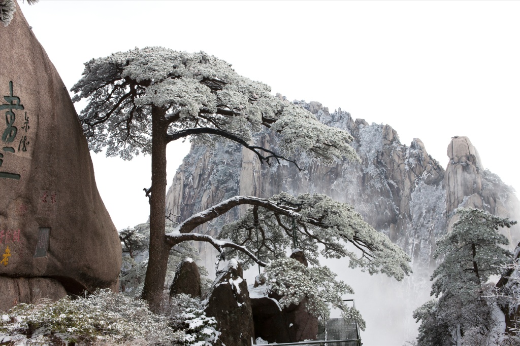 【冬】:黄山冬天的景色非常迷人有特色,满是江山雪,群峰披玉,雾凇奇美,飘雪盛景宛若冰雪童话世界。